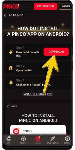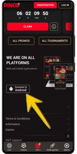 Although most players use the mobile version of the site, we also offer a convenient casino app. It can be downloaded directly from the official site, without Google Play. Simply complete the Pinco app download for android by following the steps below.